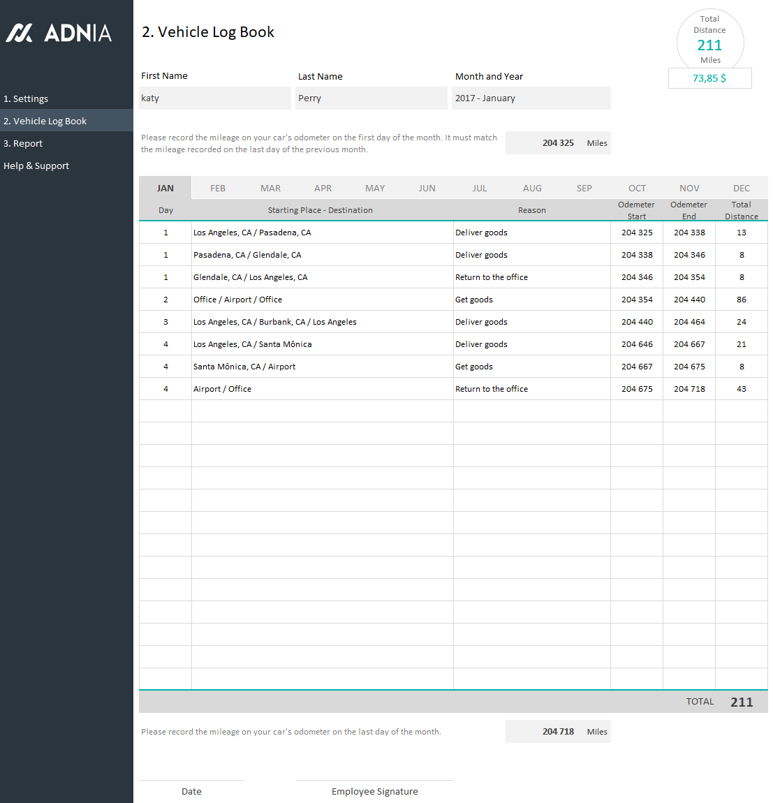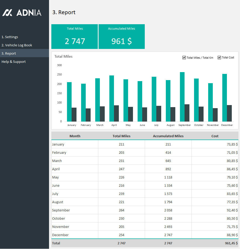 The Adnia Mileage Tracker is a multi-language Excel template that helps take the hassle out of mileage reporting. Use this spreadsheet template to record travel for mileage reimbursement requests, tax deductions, or vehicle maintenance.