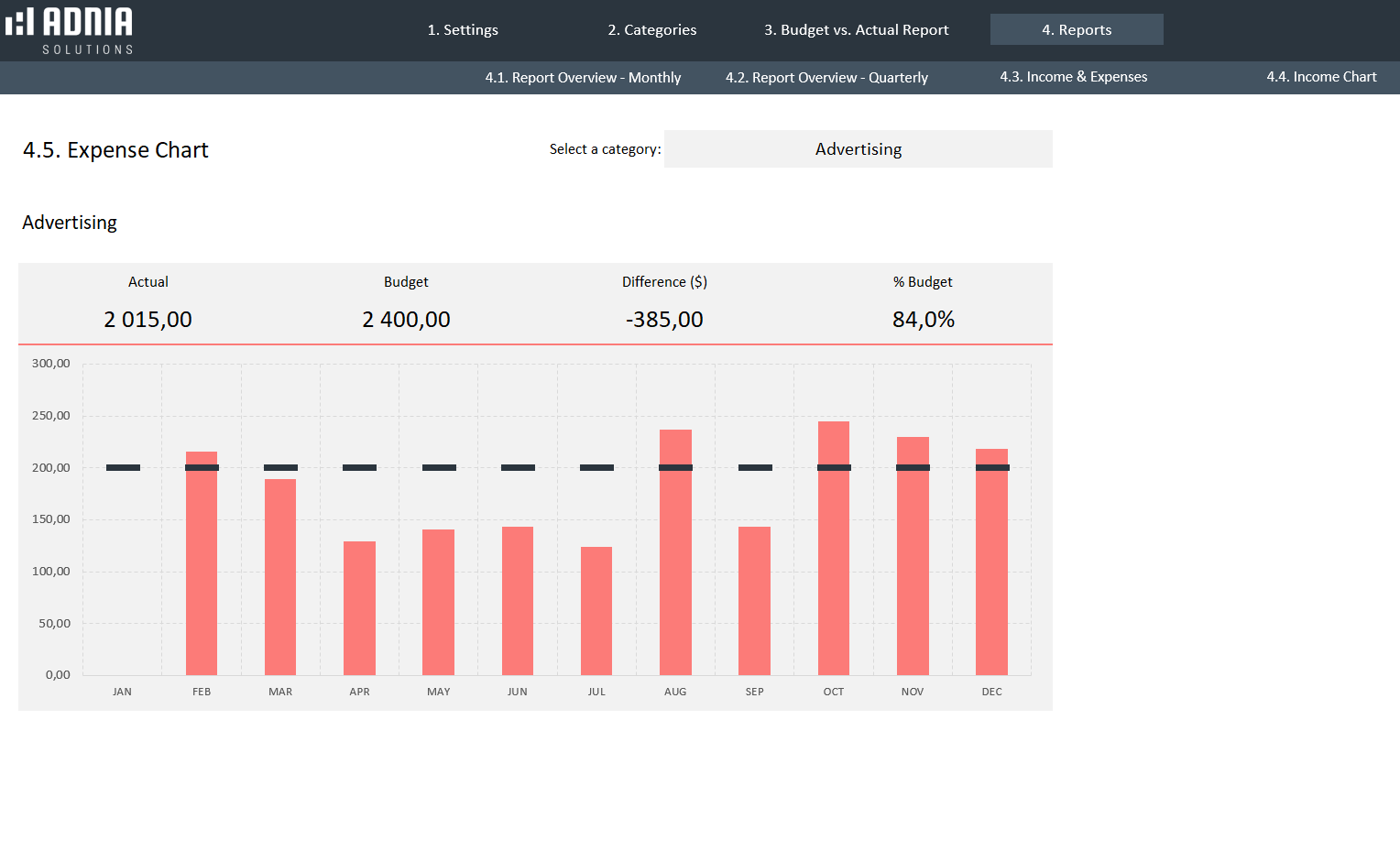 - Allocating and monitoring budgets by month and category (income and expense)