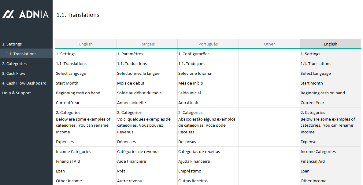 - Multilingual template: Select one of the available languages (English, French, or Portuguese) or manually translate to the language of your choice