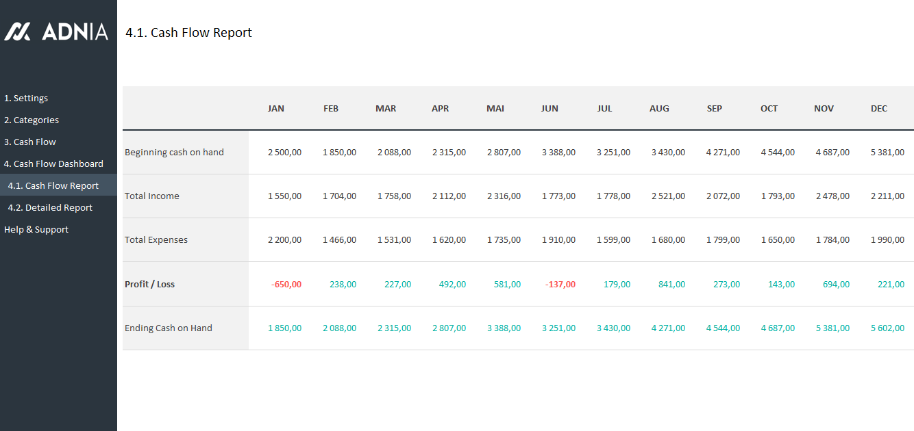 - Spreadsheets ready for printing without Adnia logo