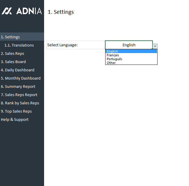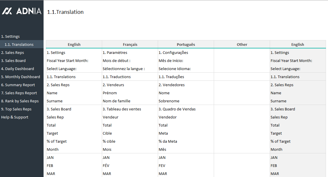 - Multilingual template: Select one of the available languages (English, French, or Portuguese) or manually translate to the language of your choice