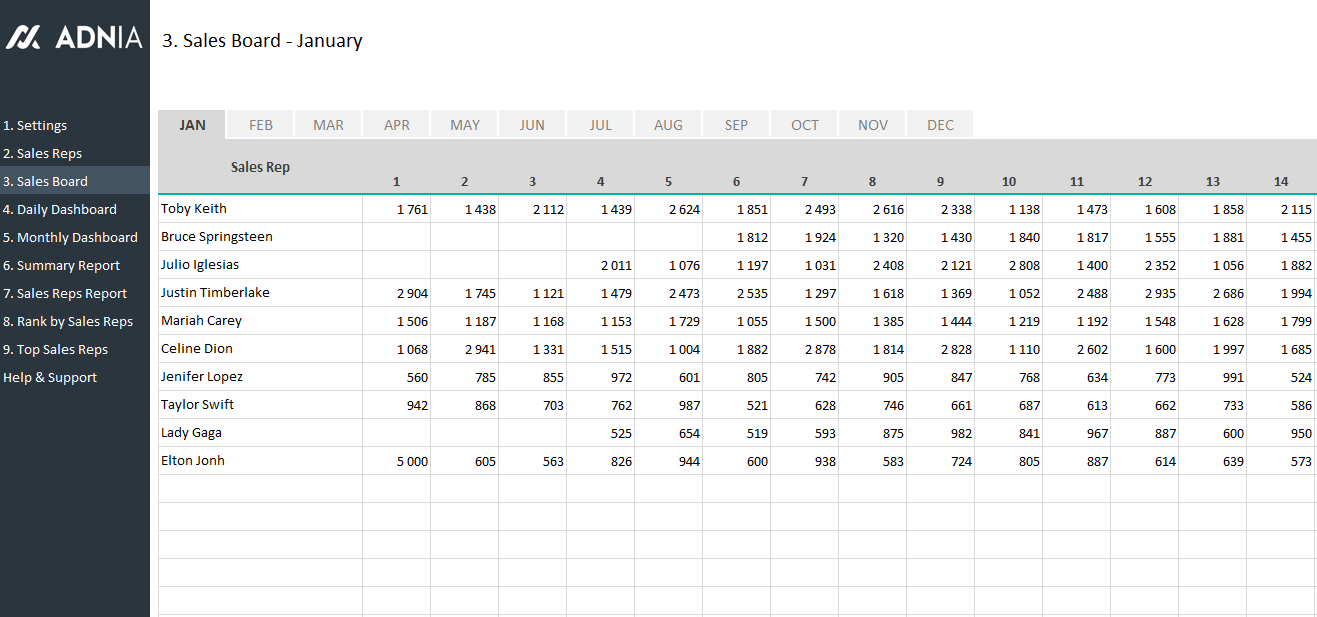 Our Daily Sales template give you all the tools you need to build your own sales board with our appealing visuals and reports. Motivate your team by displaying sales rankings for everyone on the team. This spreadsheet template is easy-to-use and multilingual.