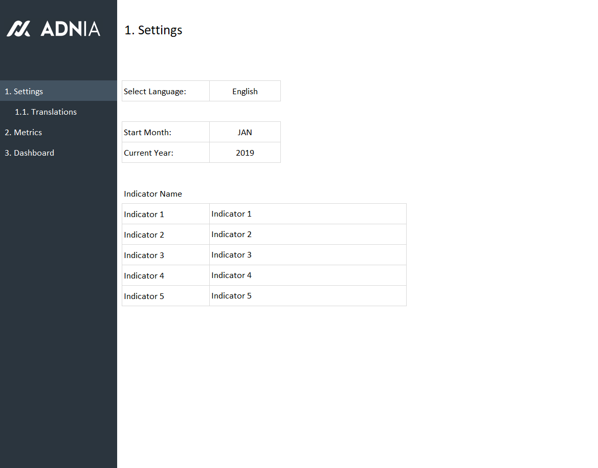 - 12-month template with 5 indicators and 7 charts