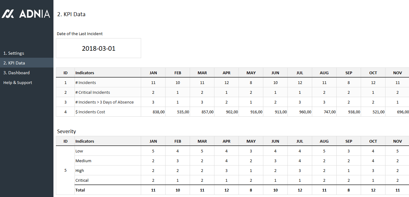 Adnia Solutions presents a new way to monitor important events in employee health and safety. The Health and Safety Dashboard (which doubles as an Incident Dashboard) is an Excel spreadsheet template designed to make incident reporting more efficient. Confidential incident information is maintained in one place and is easily updated.