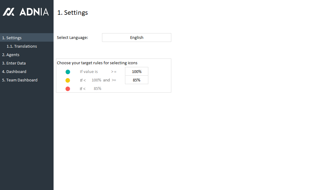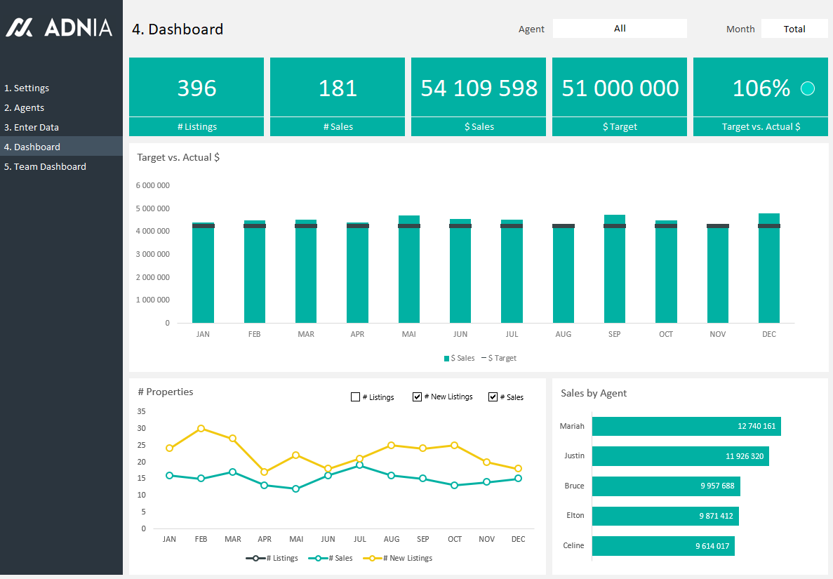 The Adnia Solutions Real Estate Agent Dashboard is designed to help you monitor and improve the performance of your sales team. Just enter data for each agent and this Excel spreadsheet template automatically calculates important values and displays them beautifully. Familiar red-yellow-green color scheme indicates distance from the goal, and you decide the levels.