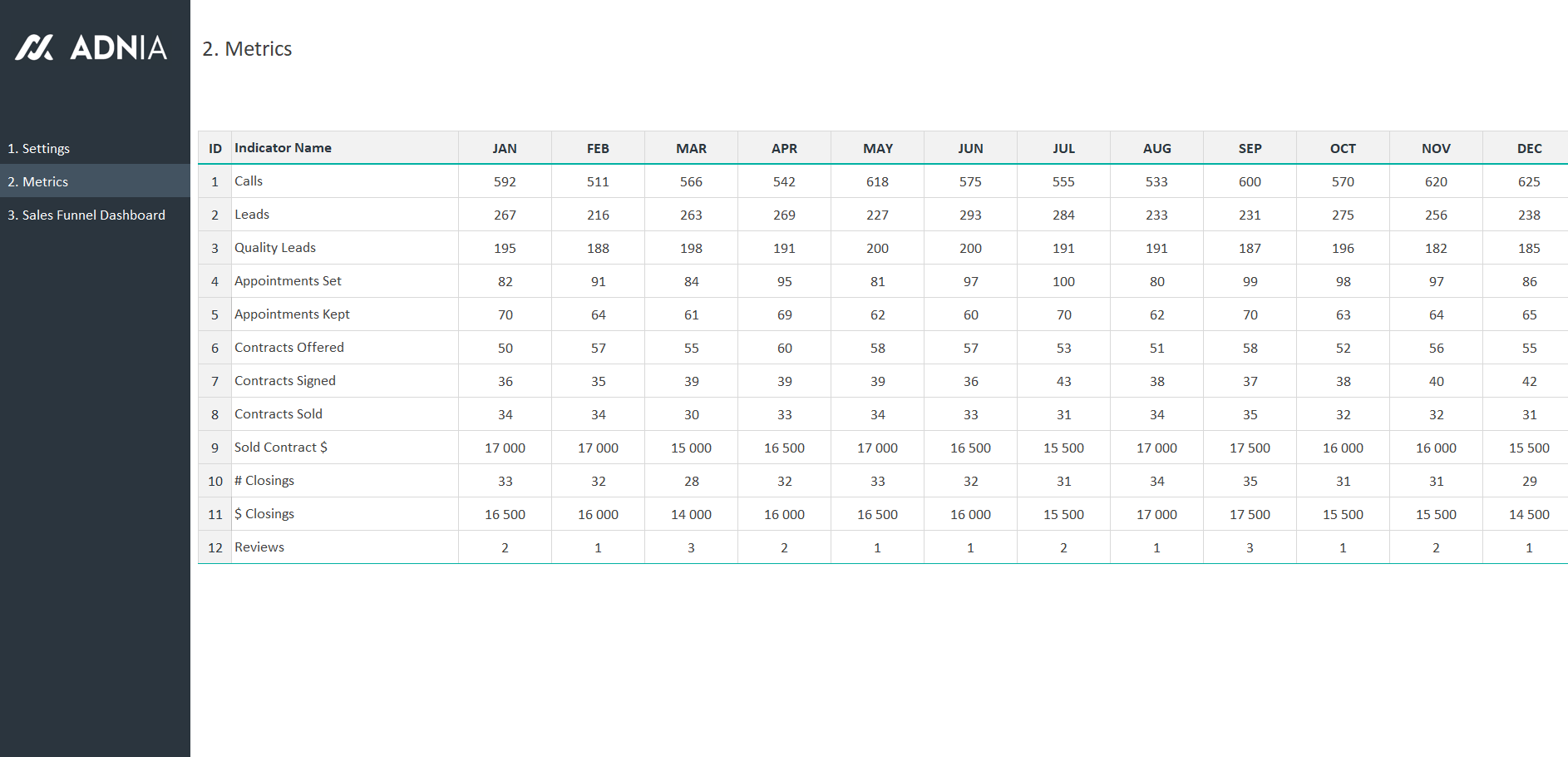 - 12 Indicators: Calls, Leads, Quality Leads, Appointments Set, Appointments Kept, Contracts Offered, Contracts Signed, Contracts Sold, Sold Contract $, # Closings, $ Closings and Reviews