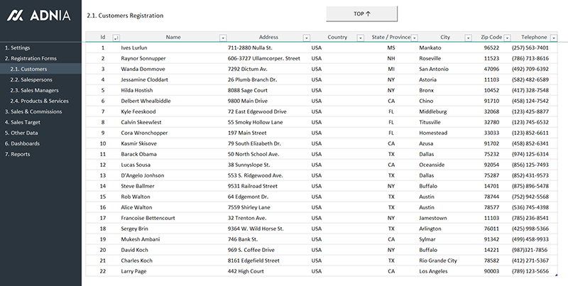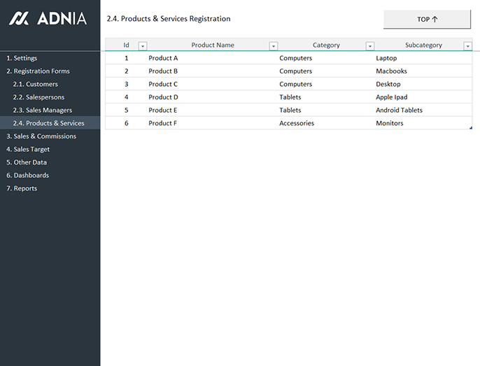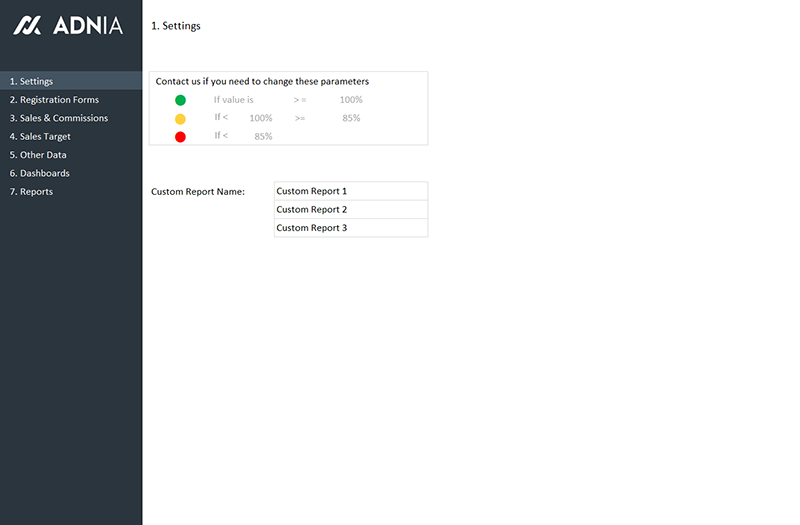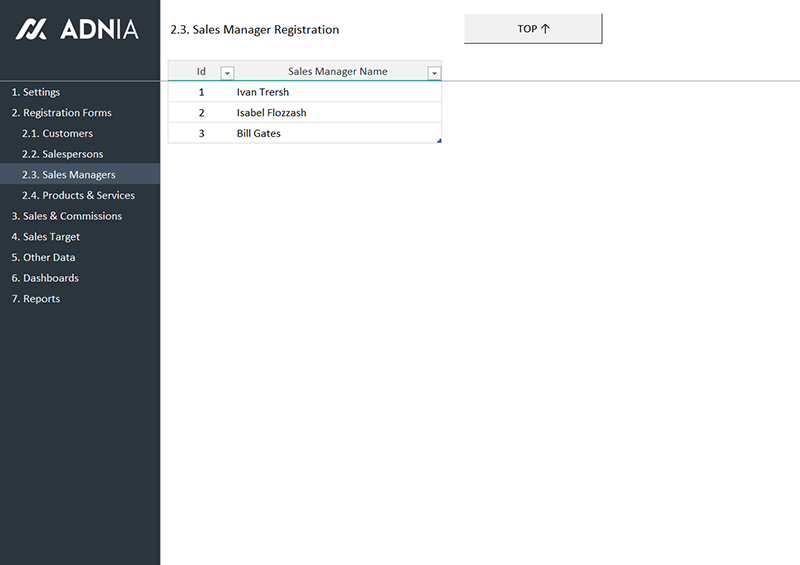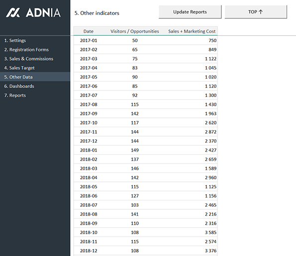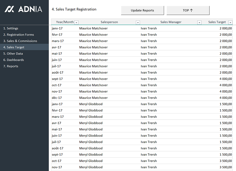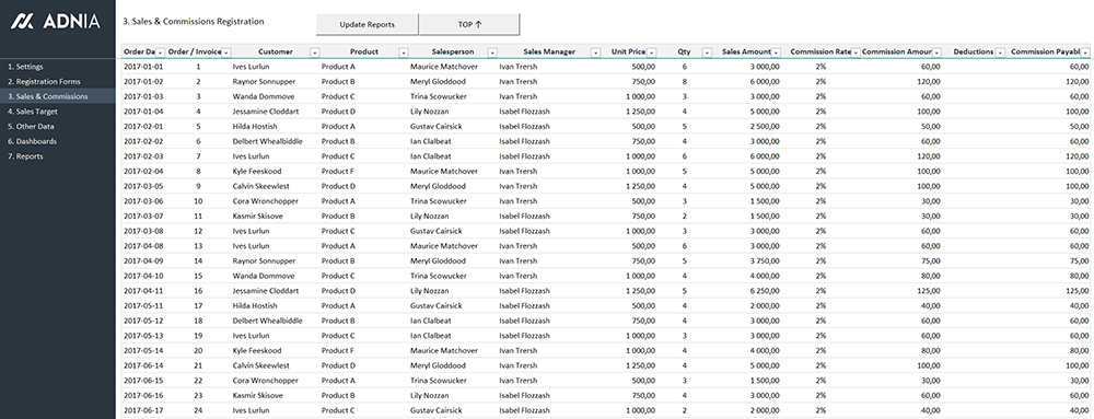 This template is so easy to use. Start by registering your sales team, products and customers. Then, enter your sales data in the appropriate worksheet, set your sales goals and click the “Update Reports” button. All your sales indicators and reports will be updated automatically.