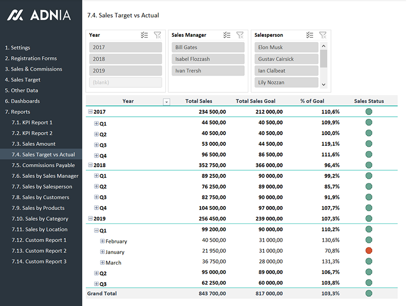This versatile Excel template was developed using Microsoft Power BI technology (Power Query & Power Pivot) and is complete with macros to automatically update your reports. Sales KPI and Commission Tracker contains 4 dashboards and 14 ready-to-use reports with slicer options. You can also create custom reports using Pivot Table.