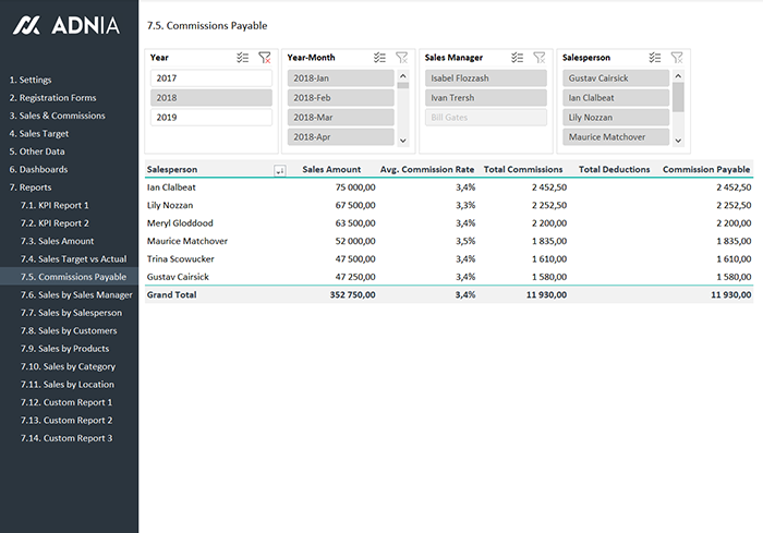 - Commission Dashboard – View all your commission data in 3 visuals by salesperson and manager
