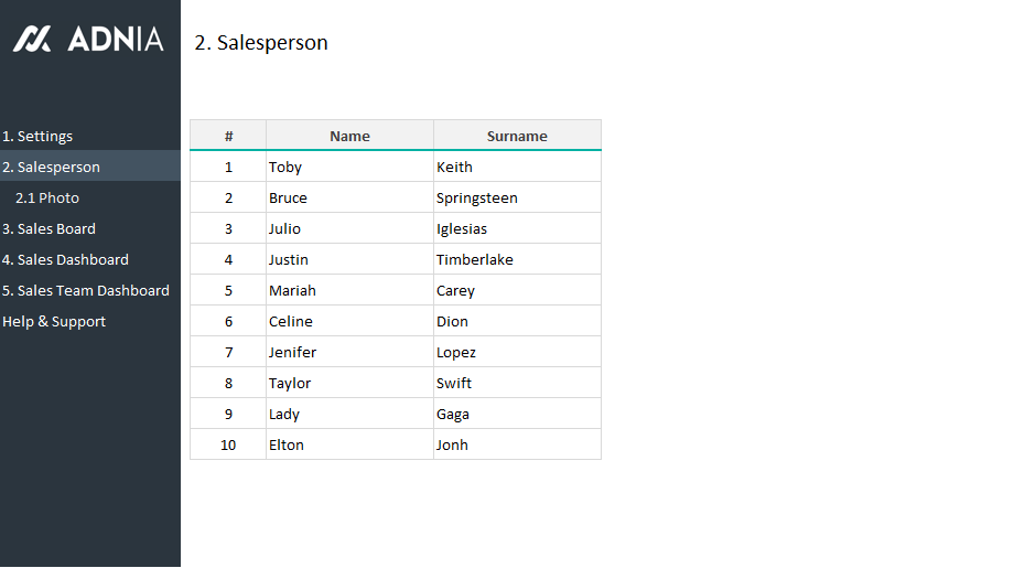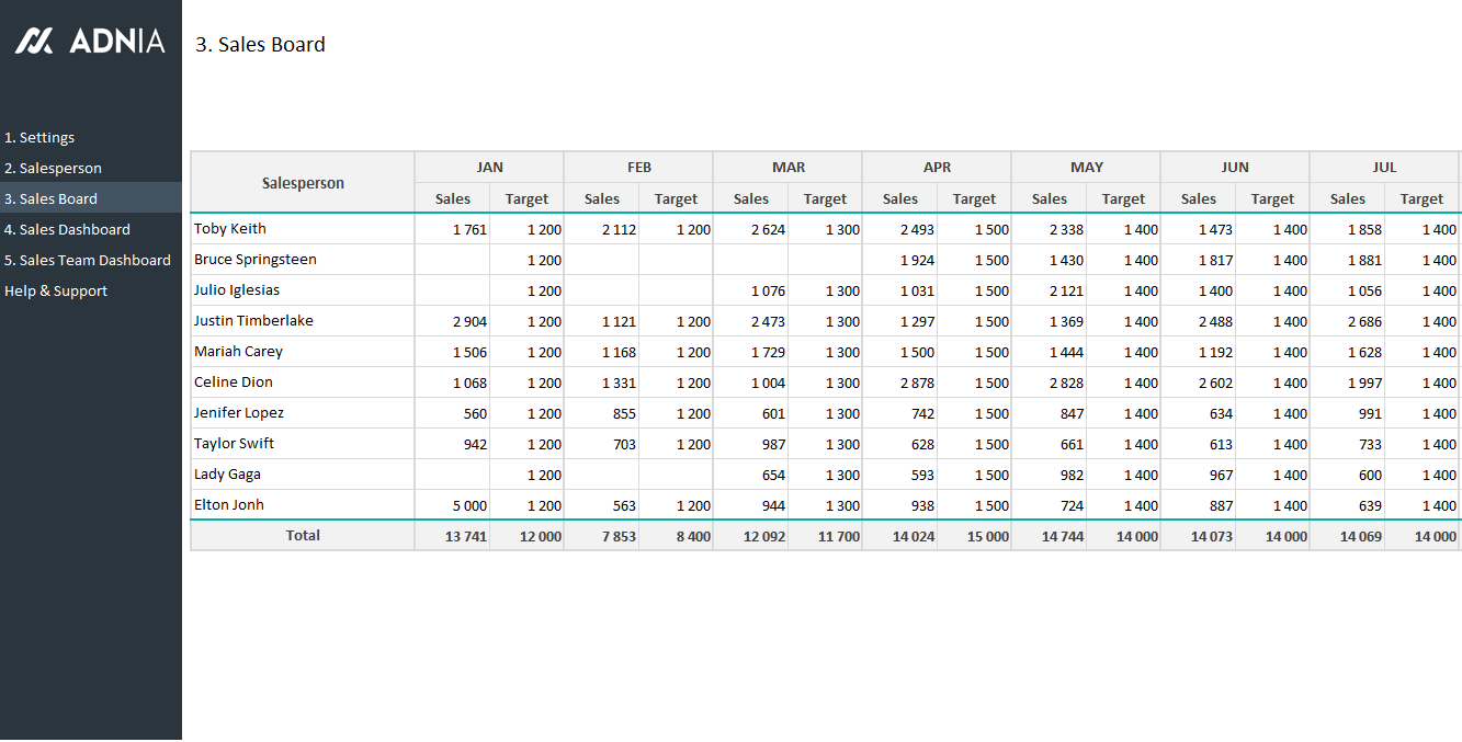 The Adnia Sales Team Dashboard is an Excel spreadsheet template for managing your sales team as a whole and by individual salesperson. This template helps you track the efficacy of your sales team- you set the goals and follow their daily sales performance. This template is multi-lingual and features 2 dashboards where you can see your overall sales summary and ranking by individual salesperson. Our Sales Team Dashboard template gives you everything you need to build a professional sales board with our robust visuals and reports.