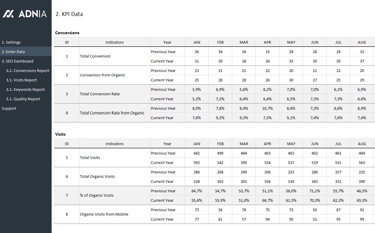 - Spreadsheets ready for printing without Adnia logo
