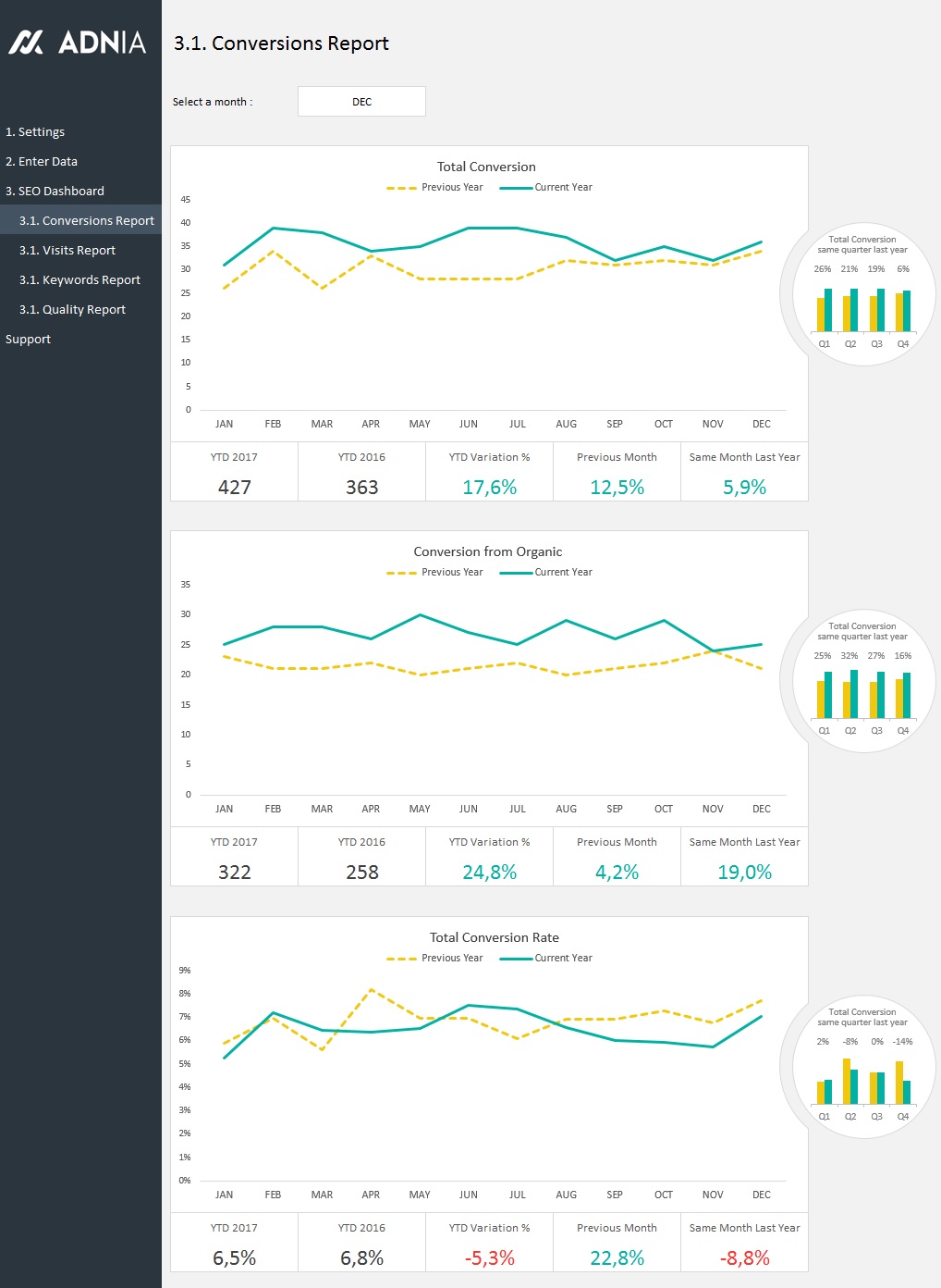 You can view the sleek and easy-to-read SEO Dashboard and reports including Conversions Report, Visits Report, Traffic Keywords Report and Quality Organic Visits Report.