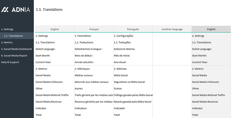 - Multilingual template: Select one of the available languages (English, French, or Portuguese) or manually translate to the language of your choice